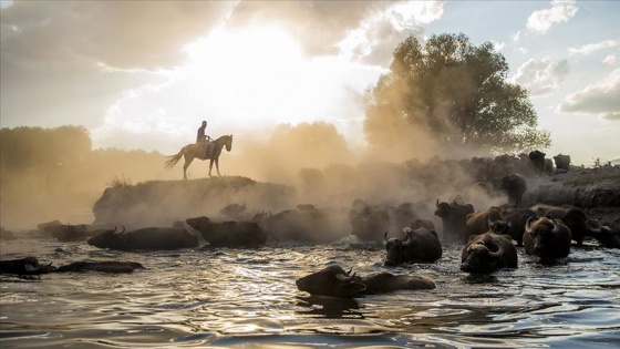 Sürünün kaldırdığı tozun içindeki mandaların, güneşin batışında oluşturduğu görsel şöleni izlemek için özellikle fotoğraf tutkunları mahalleyi mesken tutuyor.
