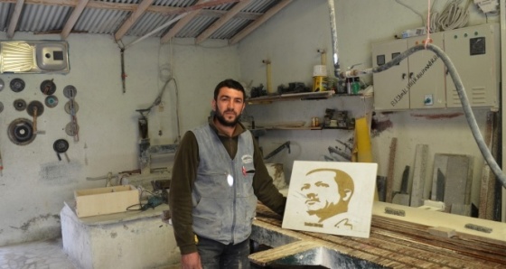 13 yıldır mermer işiyle uğraştığını ifade eden Vedat Birdal, boş zamanlarını değerlendirmek amacıyla hayranı olduğu Cumhurbaşkanı Recep Tayyip Erdoğan’ın portresini mermere işlemeye karar verdiğini söyledi. 28 yaşındaki 2 çocuk babası Vedat Birdal, Cumhurbaşkanı Recep Tayyip Erdoğan’a duyduğu hayranlıktan dolayı dört günlük çalışma sonucunda böyle bir eser ortaya çıkardığını belirtti. Vedat Birdal, boş vakitlerinde mermer üzerine çeşitli çalışmalar yaptığını da ifade ederek, “13 yıldır mermer ustası olarak çalışıyorum. Boş zamanlarımı değerlendirmek amacıyla mermer üzerinde el işçiliği de yapmaktayım. Cumhurbaşkanımız Recep Tayyip Erdoğan’a olan hayranlığımdan dolayı dört günlük bir çalışma sonucunda Cumhurbaşkanımızın portresini mermere işledim. Yaptığım portre oymadır, el işçiliğidir. Aynı zamanda mermerden süs eşyaları ve spor takımlarının amblemlerini yapıyorum. Mermer ve taş işleriyle uğraşmayı seviyorum. Bundan böyle bu tür işleri yapmayı istiyorum” dedi.