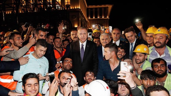 Çalışmalar hakkında bilgi alan Erdoğan, incelemelerinin ardından inşaat işçileriyle hatıra fotoğrafı çektirdi.