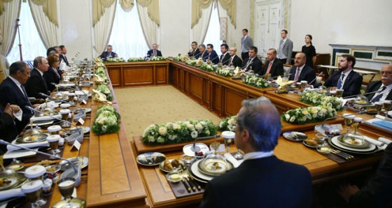 Rusya’nın St. Petersburg kentinde bir araya gelen Cumhurbaşkanı Recep Tayyip Erdoğan ve Rusya Devlet Başkanı Vladimir Putin daha sonra iki ülkenin heyetleri arasında düzenlenen çalışma yemeğine katıldı. Yemekte konukların önüne iki liderin tokalaşma karelerinin olduğu tabaklar konuldu. Heyetler arası çalışma yemeğine Başbakan Yardımcısı Mehmet Şimşek, Dışişleri Bakanı Mevlüt Çavuşoğlu, Kültür ve Turizm Bakanı Nabi Avcı, Ekonomi Bakanı Nihat Zeybekci, Gıda, Tarım ve Hayvancılık Bakanı Faruk Çelik, Enerji ve Tabii Kaynaklar Bakanı Berat Albayrak ile MİT Müsteşarı Hakan Fidan da katıldı.