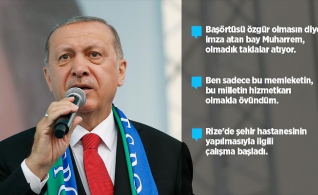 RİZE (AA) - Cumhurbaşkanı ve AK Parti Genel Başkanı Recep Tayyip Erdoğan, CHP'nin cumhurbaşkanı adayı Muharrem İnce'yi eleştirerek, "Çıkmış diyor ki 'Ben zenci Türklerdenim, Erdoğan Beyaz Türk.' Ne dersen de, bunlar tutmaz. Ben, bu ülkenin has evladıyım. Hiçbir zaman beyaz Türk olmakla övünmedim. Sadece bu memleketin, bu milletin hizmetkarı olmakla övündüm." dedi.