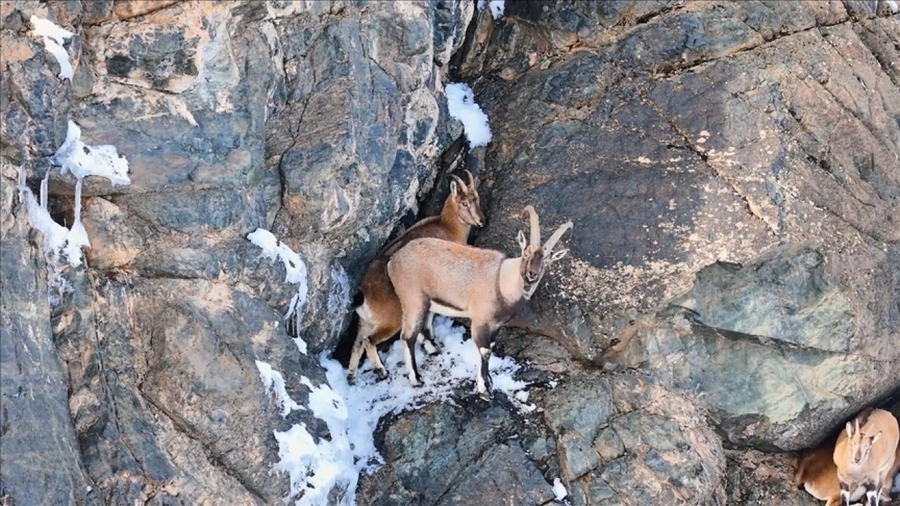 Karla kaplı dağların zirvesindeki kayalıklarda görülen çok sayıda yaban keçisi dronla kayıt altına alındı.
