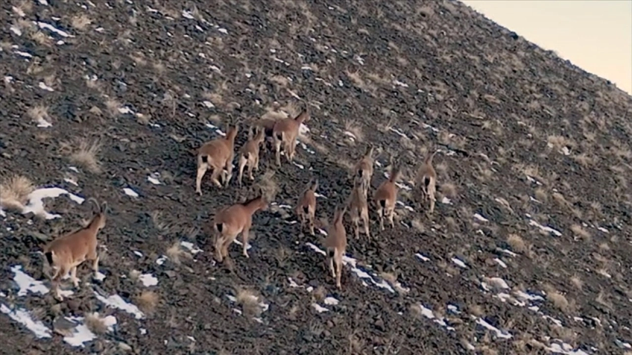 Bir bölümü karla kaplı Munzur Dağları zirvesinde sürü halinde dolaşan yaban keçileri dronla kayıt altına alındı.