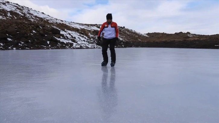 Atilla, yüzeyinde yaklaşık 15-20 santimetre buz tabakası oluşan Yedigöller'de doğa ve manzara eşliğinde buz pateni yaptı.