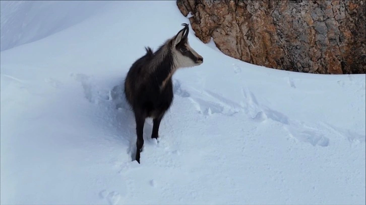 Dağın karlı zirvesinden aşağı kısımlara inen keçilerin, havadaki drona bakmaları da görüntülerde yer aldı. Kayıtlarda, yörede "Şamua" olarak da bilinen çengel boynuzlu dağ keçilerinin kimi zaman dronu fark edince kaçtığı da görülüyor.