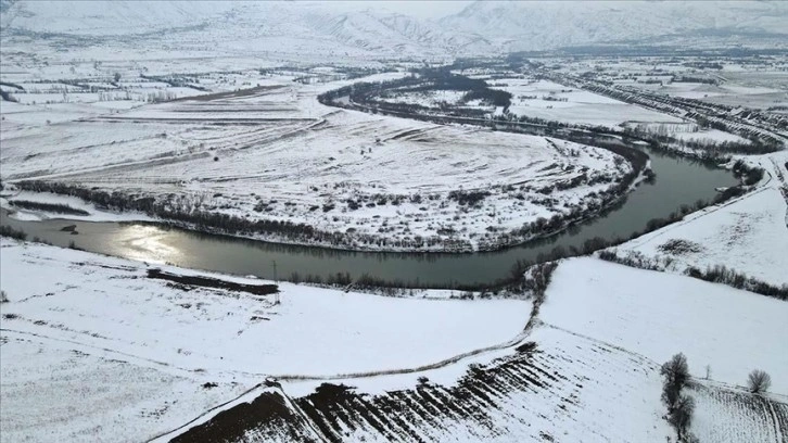 Erzincan'da, Karasu Nehri'nin oluşturduğu mendereslerin çevresi, kentte etkili olan kar yağışının ardından beyaz örtüyle kaplandı.