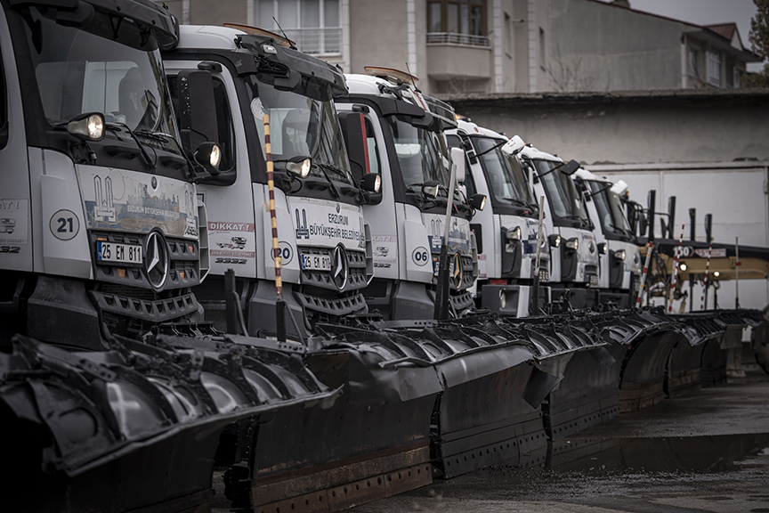 Kar yağışı öncesi tüm hazırlıklarını tamamlayan Erzurum Büyükşehir Belediyesi, karla mücadele için greyder, kazıcı-yükleyici, kar bıçaklı kamyon, kar bıçaklı tuzlama kamyonu, rotatif ve taşıyıcı tır gibi iş makinelerini bakımdan geçirdi.