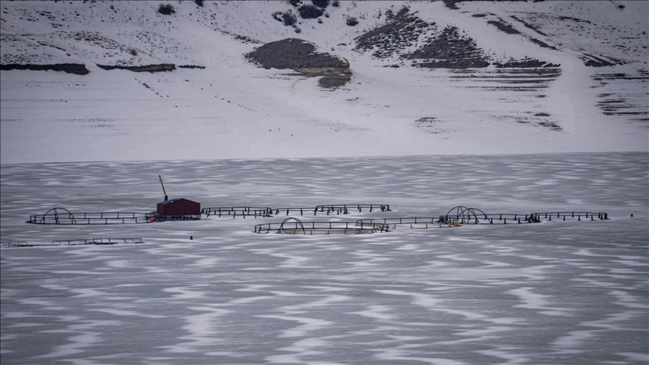 Balıkçılık da yapı lan Barajı n ortasında yer alan kafesler, soğuk havanın etkisiyle buza gömüldü.