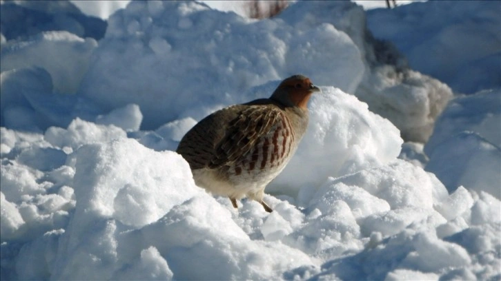 Doğa Koruma ve Milli Parklar (DKMP) Erzurum Şube Müdürlüğünde görevli veteriner hekim Selçuk Albayrak bir süre önce kırsal alanda karlar üzerinde dolaşan çok sayıda çil keklik gördü.
