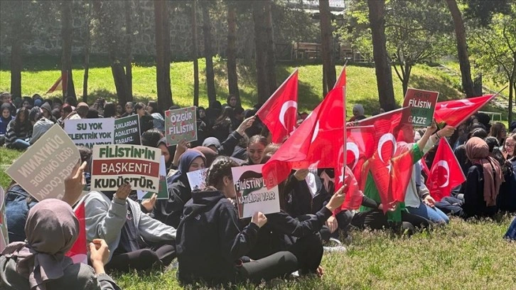 Kentteki liselerde eğitim gören öğrenciler, İsrail'in Gazze'ye saldırılarını kınamak için okullarının bahçelerinde bir araya geldi.
