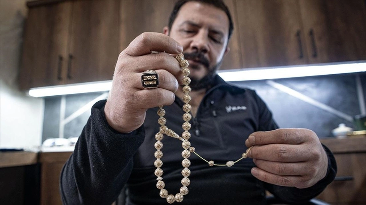 "tesbihin yapımı yaklaşık 2 ay sürdü, Rusya'daki Kaliningrad şehrinden çıkan kaya damla kehribardan yapıldı. tesbihin işlenebilmesi çok meşakkatliydi. Oltu taşının yanı sıra damla kehribar, yapımı en zor taşlardan biridir. Üzerinde yaklaşık 55 gram 24 ayar altın kullandık. Oyup yerleştirme işlemi çok zor, kırmamaya özen gösterdim ve sahibine teslim edeceğim. tesbih yaklaşık 450 bin lira. Mücevherat değeri de var, özel işçilik olduğundan dolayı pahalı."