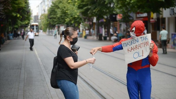 Örümcek Adam kostümünü giyen Uysal, merkez Tepebaşı ilçesine bağlı Doktorlar Caddesi'nde elindeki "maskeni tak, kahraman ol" pankartıyla kent sakinlerine maske verdi, Kovid-19 salgınından korunmadaki tedbirlerin önemine dikkat çekti.