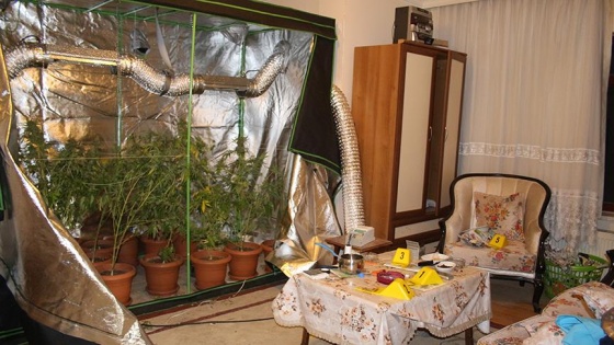 Mamak İlçe Emniyet Müdürlüğüne bağlı Suç Araştırma Büro Amirliği ekiplerince yapılan aramada, çok sayıda Hint keneviri, fanus içerisinde çok sayıda Hint keneviri fidanı, 40 kilo esrar, bir hassas terazi, bir ruhsatsız tabanca, bitki yetiştirmede kullanılan zirai ilaç, gübreli toprak, ısı ve nem ölçer aletler ele geçirildi.