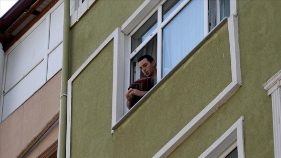 Bora, koronavirüs tedbirleri kapsamında hem sosyal izolasyonun önemine dikkati çekmek hem de mahallesinde dışarı çıkamayan komşularına moral vermek için evinin penceresinde tulum çalıyor.