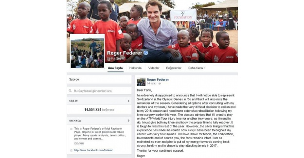 Tek erkeklerde 17 kez grand slam kazanan tenis tarihinin yaşayan efsanesi Roger Federer, sosyal medya hesabından yaptığı açıklamada, 2016 Rio Olimpiyat Oyunları’nda yer alamayacağını ve sezonun geri kalan turnuvalarına da dizindeki sorun nedeniyle katılamayacağını söyledi. Federer, bu durumundan dolayı büyük üzüntü duyduğunu belirtirken, 2017 yılında sağlıklı ve güçlü bir şekilde kortlara dönmeyi planladığını aktardı.