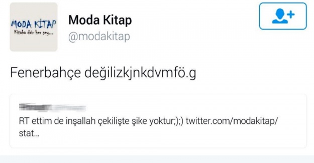 Twitter hesabından bir duyuru yapan Moda Kitap, atılan tweet’i reteweet eden takipçilerine Ramazan Bayramı dolayısıyla kitap hediye edileceğini duyurdu. Bu tweeti gören bir takipçi, "RT ettim ama inşallah şike yoktur" yazınca Moda Kitap’tan Fenerbahçelileri ayağa kaldıran "Fenerbahçe değiliz" cevabı geldi.