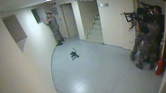 Şüphelilerin etkisiz hale getiriliş anıSonrasında etkisiz hale getirilerek gözaltına alınan askerlerin sivil kıyafet giydirilerek kuleden çıkarılış görüntüleri güvenlik kameralarına yansıyor.