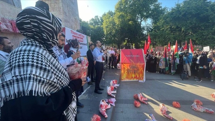 Saraçhane Parkı'nda toplanan grup, ellerinde Filistin bayrakları taşıyarak İsrail aleyhine sloganlar attı. Grup üyeleri, Saraçhane Meydanı'na protesto amacıyla çadır, başları kopmuş oyuncak bebekler ve bebek kıyafetleri koydu.