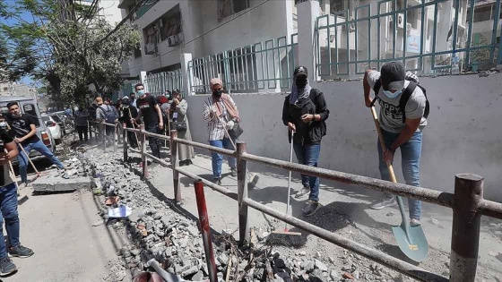 İsrail uçaklarının yerle bir ettiği binaların bulunduğu bölgelere dağılan gençler, ellerinde süpürgeler ve temizlik malzemeleriyle sokakları kaplayan enkaz parçalarını temizlemeye başladı.