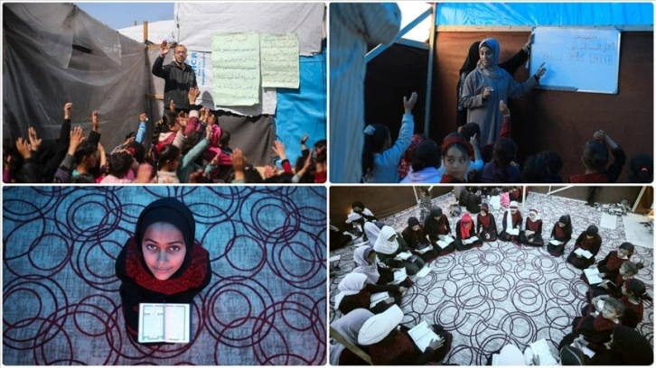 Gazze Şeridi'nde aylardır aralıksız devam eden İsrail saldırıları nedeniyle evlerini terk ederek bölgenin güneyindeki Refah kentine sığınan Filistinli çocuklar, derme çatma çadırlarda eğitime devam ediyor.