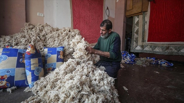 bluka altındaki Gazze Şeridi'nde yaşayan Filistinli Salim el-Akluk (55), yaklaşık bir asırdır bu işi yapan ailesinden miras aldığı yorgancılığı torunlarına da aktarmak istiyor.