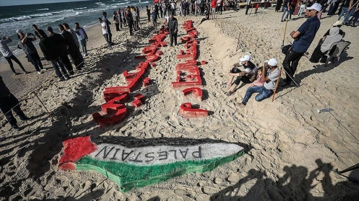 Filistin Mülteci İşleri Dairesi tarafından düzenlenen organizasyonda, Nekbe'nin yıl dönümünü anmak için deniz kumundan 15 metrelik Filistin haritası yapıldı.