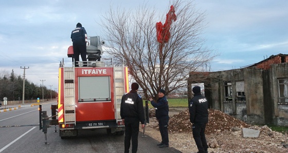 Olay yerine giden itfaiye ekipleri araç merdiveni yardımıyla ağacın üzerindeki Türk Bayrağını toplayarak indirdi.
