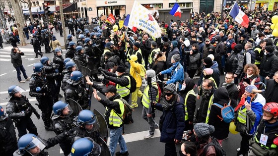 Sarı yelekliler gösteriye katılarak, reformu protesto edenlere destek verdi. Göstericiler, Macron yönetimi karşıtı sloganlar attı.