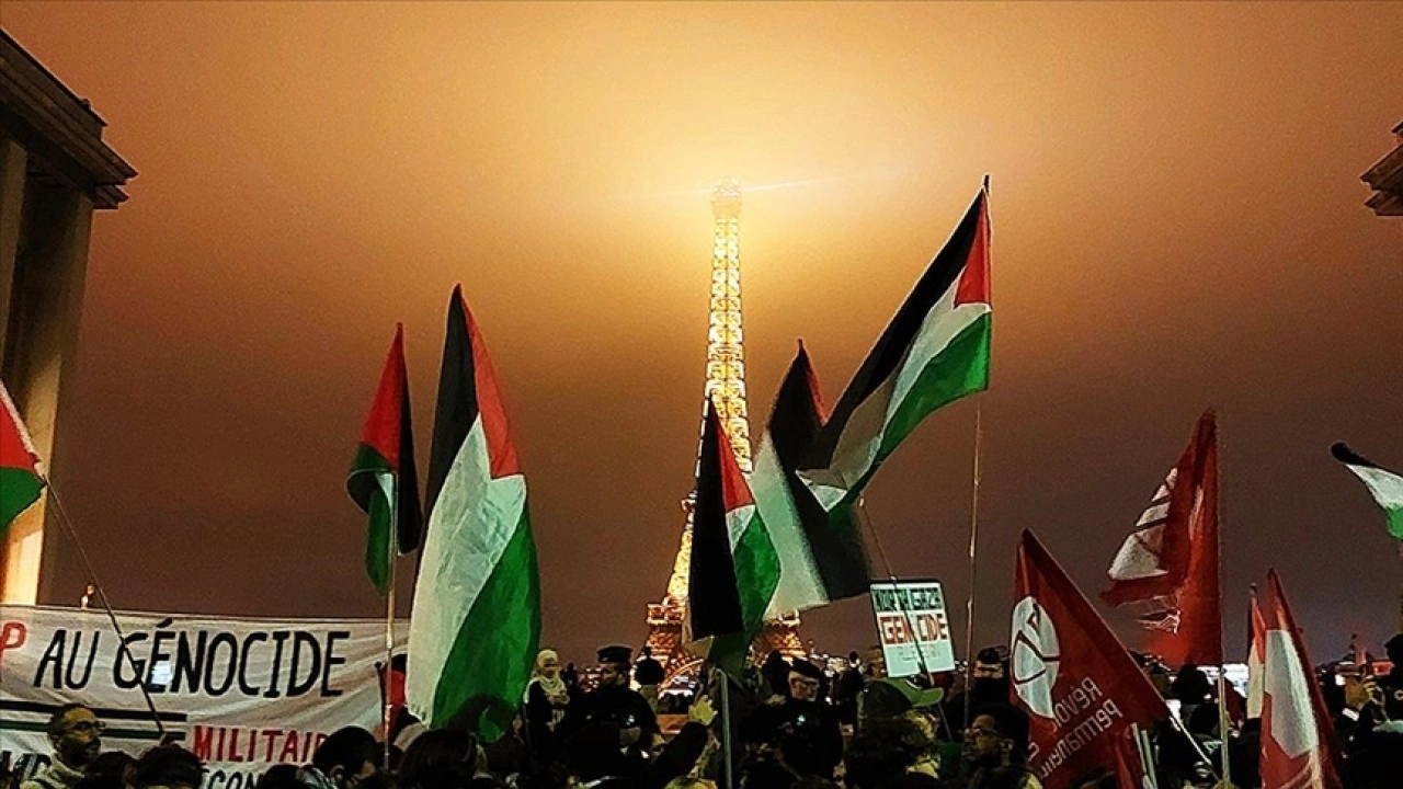 Filistin destekçileri, Paris'te Eyfel Kulesi'ne yakın Trocadero Meydanı'nda toplandı.