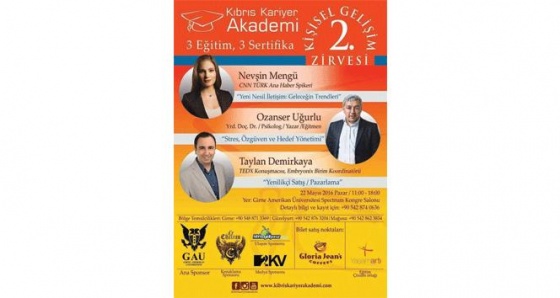 22 Mayıs Pazar günü saat 11.00’da Girne Amerikan Üniversitesi Uluslararası Spectrum Kongre Merkezinde gerçekleşecek zirvede Türkiye ve K.K.T.C 'de geçerli 3 başarı sertifikalı 6 saat eğitim verilecek. Kıbrıs Kariyer Akademi 2. Kişisel Gelişim ve Kariyer Zirvesinde, yeni nesil iletişim ve geleceğin trendleri konusunda, CNN TÜRK Ana Haber Spikeri Nevşin Mengü tarafından; hedef, özgüven ve stres yönetimi konusunda, Psikolog, Yazar ve Eğitmen Yrd. Doç. Dr. Ozanser Uğurlu tarafından ve yenilikçi satış ve pazarlama konusunda ise İzmir Ekonomi Üniversitesi Öğretim Görevlisi ve Embryonix Birim Koordinatörü Taylan Özgür Demirkaya tarafından eğitim verilecek. “Her gün durmaksızın etrafımızdaki her şeyin geliştiği ve değiştiği dünyada bireyler olarak kendimizi de geliştirmek ve çağa ayak uydurmak zorundayız” diyen CNN TÜRK ana haber Spikeri Nevşin Mengü, “Öncelikle görsel ve hayatın içindeki konum olarak kişilerde bıraktığımız imaj, onların gözündeki konumumuzla direkt ilgilidir. İlişkiler arasında yer aldığımız konumu iyi belirlersek imajımızı da ona göre daha iyi seviyelere getirebiliriz. Her gün daha çeşitlenen ve zorlaşan iletişim kanalları gelecekte daha da zor hale gelecektir. Nevşin Mengü ile yaratıcı ve eğlenceli seminer eşliğinde gelecekteki iletişiminizin temellerini atabilirsiniz” dedi.dikGAZETE.com