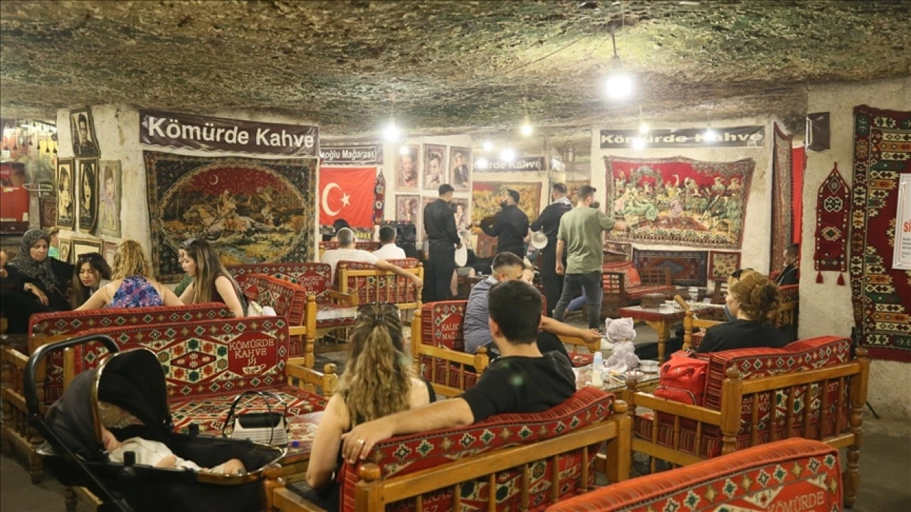 Hava sıcaklığının 35 dereceyi aştığı Gaziantep'te kent sakinleri ve ziyaretçiler, kafe olarak kullanılan mağarada serinliyor.
