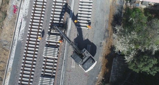 Havadan görüntülenen hatta rayların Maltepe’ye kadar döşendiği görülürken, rayların döşeme işleminin bitmesine 10 km kaldı.