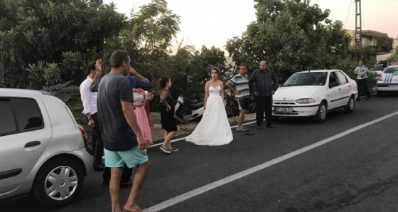 Kaza yapan otomobilin arkasındaki araçta seyir halinde olan gelin kaza sonrası gözyaşlarına boğuldu.