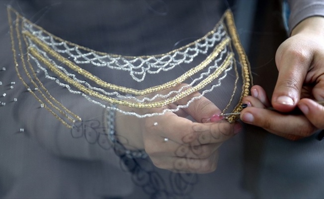 Usta eğitici Sevgi Fakiroğlu, AA muhabirine yaptığı açıklamada, Suriyeli kadınların atölyede gelinlik üzerine süsleme yapıp parça başına kazanç sağladıklarını söyledi.