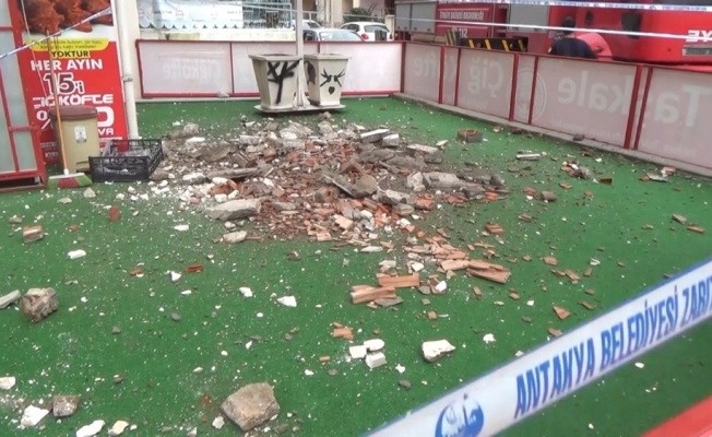 Hatay’da bir binanın üçüncü katındaki göçen balkondan kopan beton parçaları ve tuğlalar, bir işletmenin bahçesine düştü.