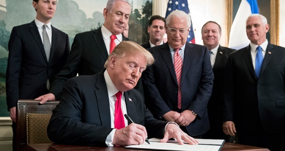 Geçtiğimiz günlerde Twitter üzerinden, Golan Tepeleri hakkında, “İsrail'in egemenliğini tanıma zamanı geldi” diyen ABD Başkanı Donald Trump, dün İsrail Başbakan Netanyahu ile bir araya geldi. Trump, "Golan Tepeleri üzerinde İsrail'in egemenliğini ABD'nin resmen tanıdığını" ilan eden o skandal kararnameyi imzaladı. İmza törenini şova çeviren Trump, “Bugün yapılan saldırı gibi bir saldırı daha görmek istemiyoruz. İsrail ile ilişkilerimiz kuvvetli” dedi. Trump'ın imzası sonrası Netanyahu da “Bu diplomatik bir zaferdir” açıklamasını yaptı. ABD'de bunlar yaşanırken, İsrail akşam saatlerinde Gazze'yi vurmaya başladı.