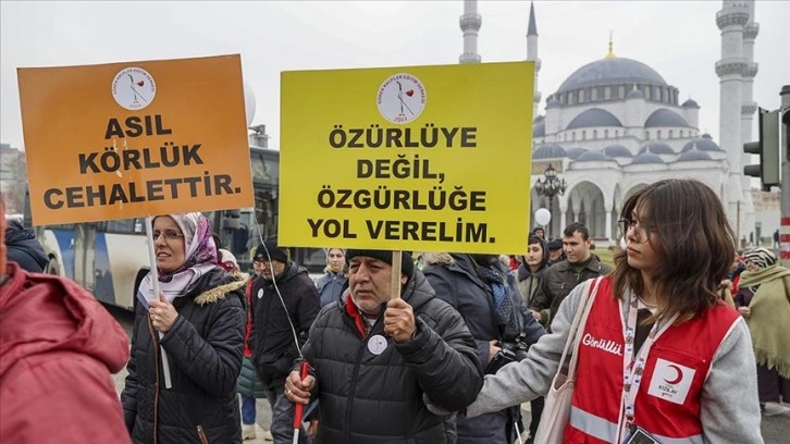 Öte yandan, görme engelliler, yürüyüş sırasında bir ellerinde baston diğer ellerinde de beyaz balon taşıdı.