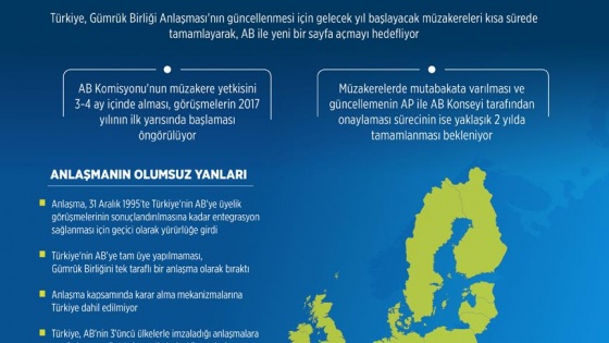 AA muhabirinin yaptığı derlemeye göre, Türkiye ile AB arasında Gümrük Birliği Anlaşması'nın güncellenmesine yönelik sürecin başlatılması kararının ardından AB Komisyonu'nun müzakere yetkisini 3-4 ay içinde alması, buna yönelik görüşmelerin de 2017 yılının ilk yarısında başlaması öngörülüyor.