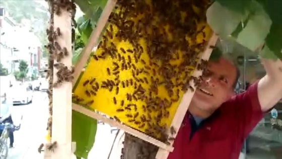 Arıcılar, vatandaşların bakışları arasında arıları peteğe alarak olay yerinden uzaklaştırdı.