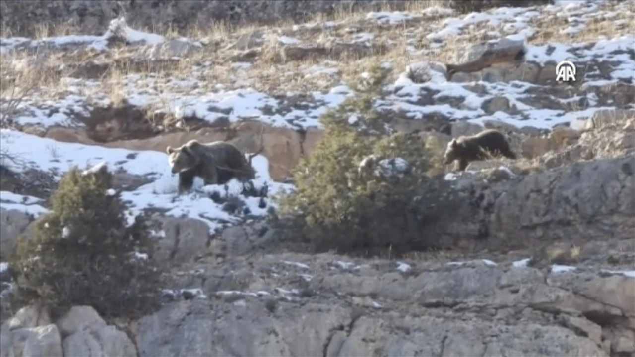 Doğa Koruma ve Milli Parklar (DKMP) Genel Müdürlüğü nün sosyal medya hesaplarından yapı lan paylaşımda, Dağ lık alanda yiyecek arayan anne ayı ve yavrusunun Gümüşhane Şube Müdürlüğü ekiplerince çekilen görüntülerine yer verildi .