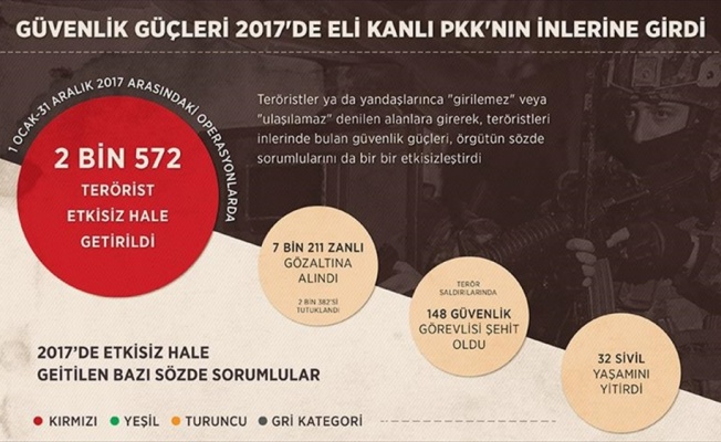 ERZURUM (AA) - Yunus Okur - Ülkenin barış ve huzurunu hedef alan, sivilleri dahi katletmekten çekinmeyen eli kanlı terör örgütü PKK'ya yönelik güvenlik güçlerince 2017'de düzenlenen operasyonlarda 2 bin 572 terörist etkisiz hale getirildi.