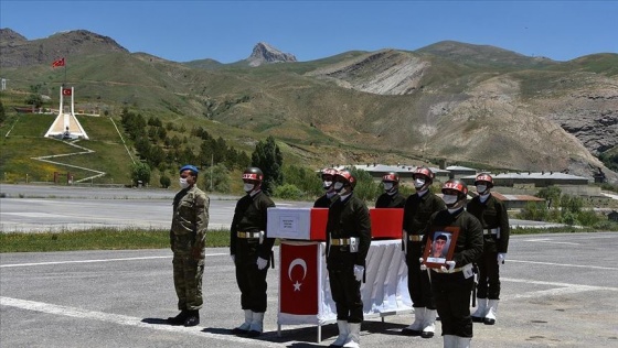 Hakkari Dağ ve Komando Tugay Komutanlığında yeni tip koronavirüs (Kovid-19) tedbirleri uygulanarak gerçekleştirilen törende şehit Piyade Sözleşmeli Onbaşı Recep Durak'ın Türk bayrağına sarılı naaşı alana getirildi.