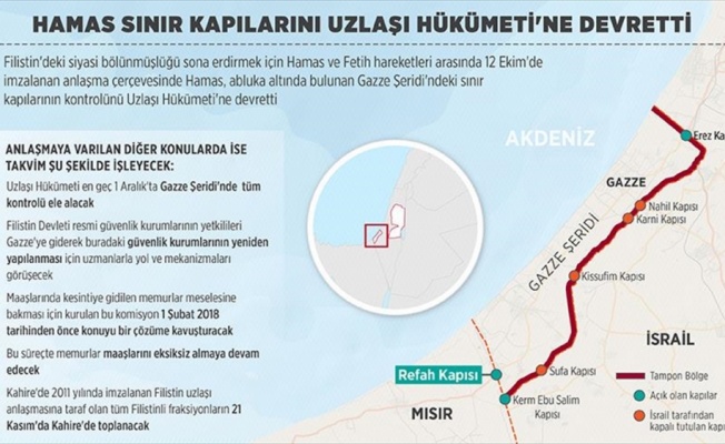 Hamas, yapılan bir törenle Gazze Şeridi'nin İsrail ve Mısır ile olan sınır kapılarındaki kontrolü tamamen Filistin Uzlaşı Hükümeti'ne devretti.