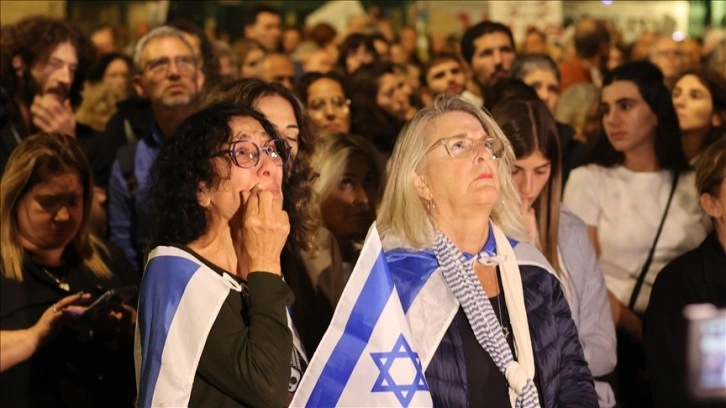 Anma törenine katılanların Gazze Şeridi'ndeki İsrailli esirler için "Onları evine getirin" pankartlarının yanı sıra hükümet karşıtı dövizler taşıdığı dikkati çekti.