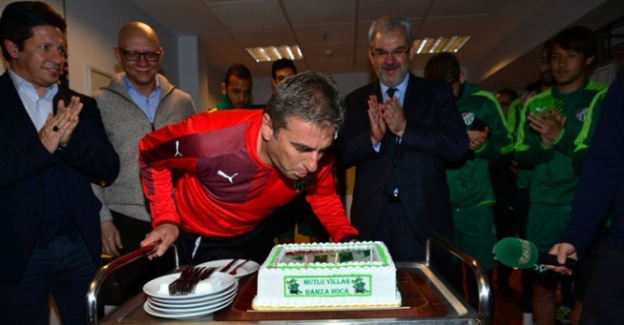 Bursaspor Teknik Direktörü Hamza Hamzaoğlu’nun 46. yaş günü yeşil-beyazlı takımın bugün gerçekleştirdiği antrenman öncesi, soyunma odası çıkışında kutlandı.