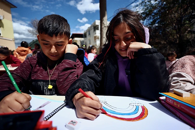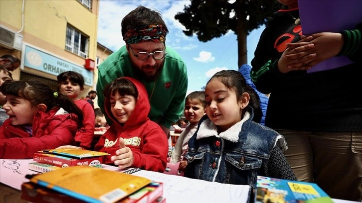 Hatay'da birçok yerde depremzede çocuklara kırtasiye malzemesi hediye eden Arman, onlarla resim çiziyor.