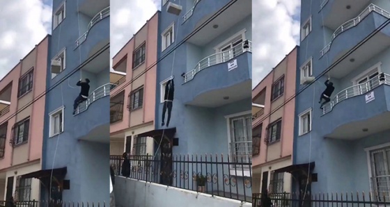Sosyal medyada on binlerce kişinin izlediği ve Adana'da çekildiği söylenen videoda bir genç, bir apartmanın 4. katına monte edilen makarayla kendisini son kattan boşluğa bırakarak eşya taşıyor. Diğer ucunda kolinin bağlı bulunduğu halata tutunan genç, 4'üncü kattan kendini boşluğa bırakıyor.