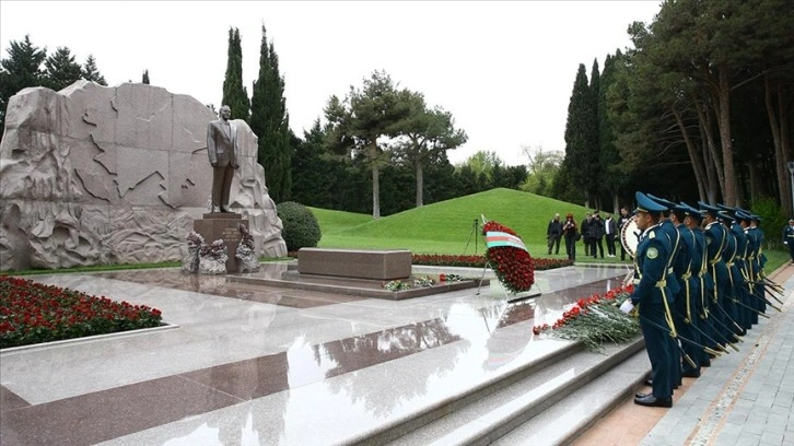 Azerbaycan milli marşının okunduğu törende Cumhurbaşkanı Aliyev, Haydar Aliyev'in mezarına çelenk bıraktı.