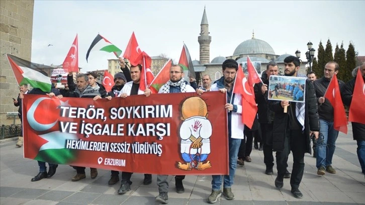 Kent merkezindeki tarihi Lalapaşa Camisi'nin önünde bir araya gelen hekimler ile sağlık çalışanları, Türk ve Filistin bayrakları eşliğinde taşıdıkları dövizler ve pankartlarla Yakutiye Medresesi'ne kadar yürüdü.
