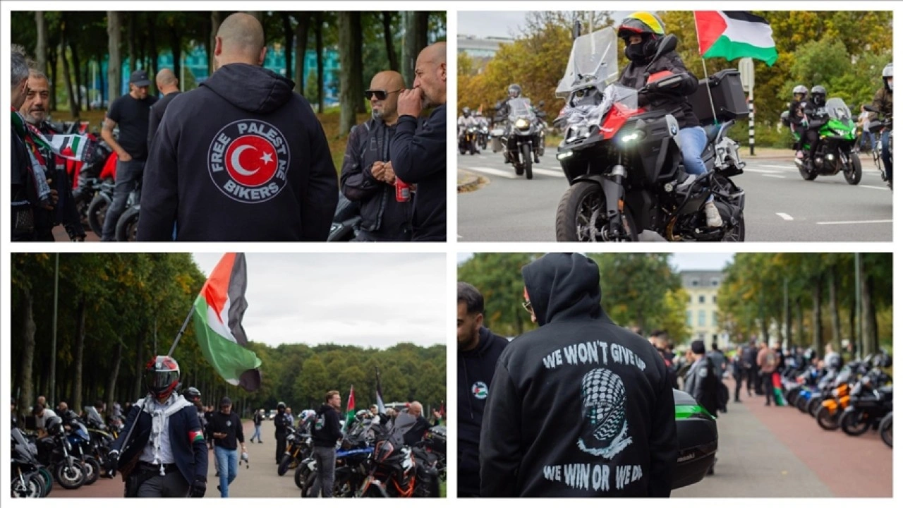 ????Malieveld Meydanı'nda buluşan motosiklet sürücüleri kentin ana caddelerinde konvoy oluşturarak Filistin'e destek gösterisi yaptı.